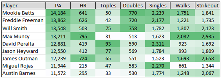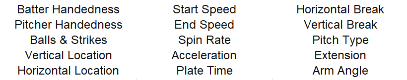 The table above shows the desired output. Each batter/pitcher matchup is assigned a probability distribution that adds up to 100%. To get to this point, we train a machine learning model over a dataset of over 1 million plate appearances since 2016. While technical aspects such as model architecture and training parameters are important, the key factor dictating prediction accuracy is the set of variables used in training.