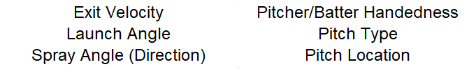 backspin produced by a pulled fly ball that allows it to carry farther. Similarly, the type and location of the pitch also contribute to the distance traveled (and therefore the outcome) in addition to how the ball exits the bat. Here is a list of factors this model uses to assign expected outcomes.