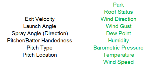 To help determine how much external stuff to put back in, we train a new variation of the Contact Model, but instead of restricting its knowledge to how the ball left the bat, we also allow insight into the environment. Here are the factors this new model uses to make predictions, with the added variables highlighted in green.