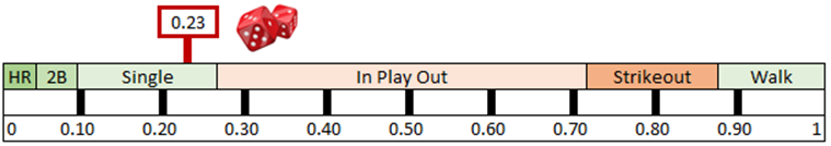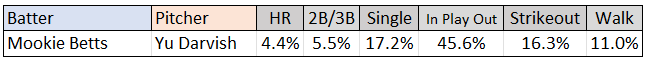 At its core, the act of simulating a game consists of generating random numbers and comparing these numbers to the outcomes predicted by probability models. Let's say the first at bat of the game is Mookie Betts vs Yu Darvish. We use the Matchup Model to assign a probability distribution of possible outcomes: