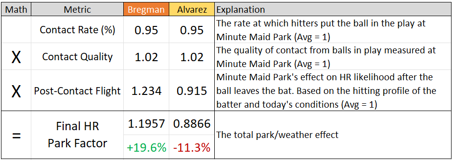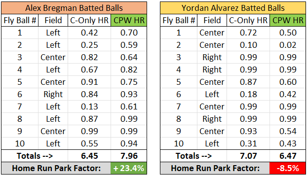 The park factors that Ballpark Pal publishes on a game-by-game basis originate at the batter level. This is important because the layout of the stadium and the nature of the day's weather will affect each player's batted ball profile differently. For example, Alex Bregman and Yordan Alvarez both play their home games in Houston, but Minute Maid Park tends to favor Bregman more. While Alvarez hits a decent portion of his barrels toward the deep center field fence, Bregman tends to pull his fly balls toward the shallow Crawford boxes in left. Here's a basic example of how park factors may be assigned to players for an individual game played at Minute Maid Park: