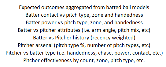 The current version of the matchup model has over 100 distinct variables, each of which are highly engineered. In other words, they don't exactly resemble a FanGraphs stat line. In fact, every "stat" that goes into the model is proprietary and developed internally. The model has no knowledge of traditional advanced metrics such as wRC+, xwOBA, OBP, BABIP, WAR, FIP, OPS+, ISO, Barrel %, or other stats that are well known to the analytics community. This is because developing predictive signals for machine learning is a different task than creating digestible stats for humans. Most of the features are derived from expectation models (as discussed toward the beginning of this guide) and aren't easy to explain in a few sentences or capture in a single formula. Although not an exhaustive list of each variable, here is a list of themes and categories represented in the dataset: