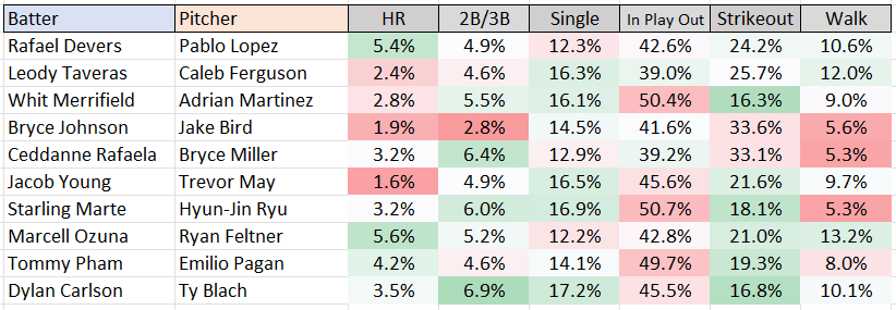 Ballpark Pal also assigns expectations to batted balls according to how they exit the bat. Like pitches, the physical aspects of a ball put in play such as exit velocity, launch angle, and direction are more indicative of the hitter's skill level than its actual result on the field. The main idea is that a hitter should be rewarded for a well-hit ball regardless of the circumstances surrounding it. Whether it ends up as a home run during a hot day at Coors Field or a flyout during a cold evening at Oracle Park should be irrelevant in forecasting that player's future performance. Similarly, he shouldn't be rewarded for barely clearing the right field wall at Yankee Stadium if that's the only park that would have failed to contain it.