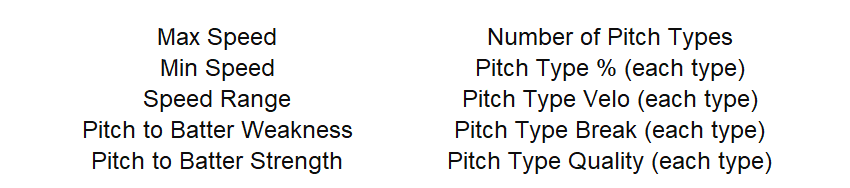 It was apparent early on in developing this model that physical characteristics combined with situational info wasn't enough to fully account for the differences between pitchers. In other words, two pitchers throwing the exact same pitch can often expect different outcomes based on their delivery, pitch sequencing, complementary arsenal, number of pitch types, knowledge of the batter's tendencies, or other soft factors they use to their advantage. Therefore, the model also tries to account for some of these important hidden differences by using features like the ones listed below. For every pitch in the training data, these types of variables are referenced alongside its physical characteristics to provide context about the pitcher's full arsenal and softer skill set.