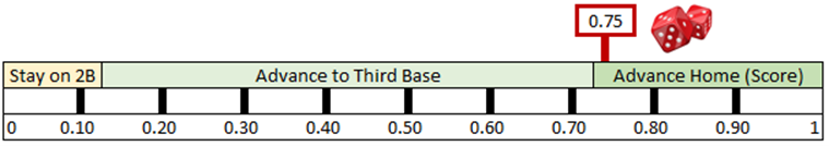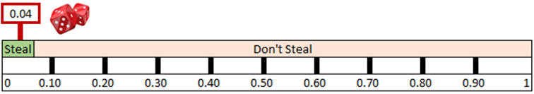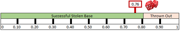 The random number generated is 0.04, which is low enough to fit into Betts' probability range for a stolen base attempt. Now we need to determine if he made it successfully or was thrown out.