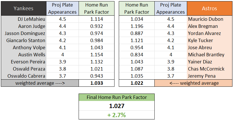 As you navigate the site, you'll see park factors assigned to each game on the slate. Since the simulations use batter-level park factors, these are provided simply for illustrative purposes. To calculate these game-level factors, we apply a weighted average to the players in each lineup according to each hitter's expected number of plate appearances.