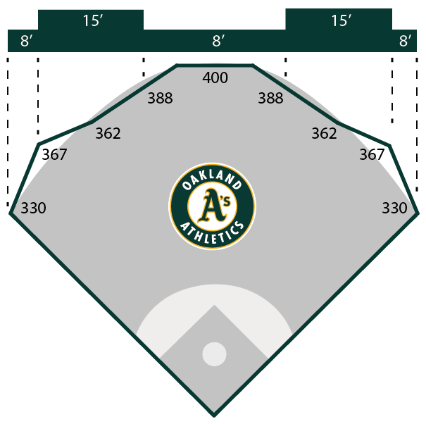 The shorter carry has some to do with temperature. It averages 72 degrees in Oakland (22nd in MLB) and only 12% of games are played above 80 degrees. The sea-level altitude doesn't help the ball carry either. Overall, Ballpark Pal rates Oakland Coliseum 26th for HRs, 25th for singles, and 7th for doubles and triples.